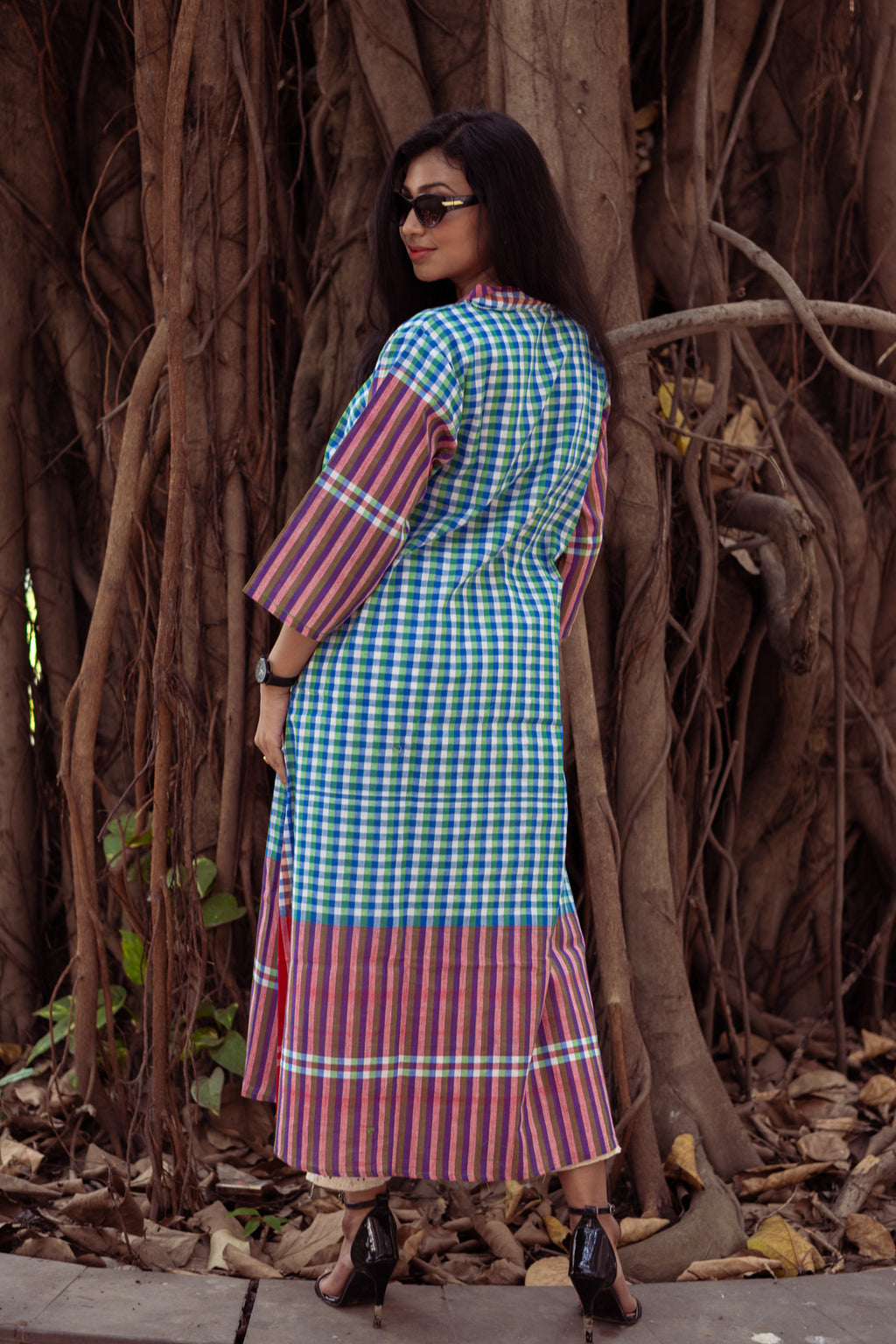The standout flare cut adds a fluid, relaxed silhouette that moves effortlessly, giving you both comfort and a refined drape. Inspired by traditional Gamcha patterns, the design carries a subtle cultural edge while staying modern and versatile.