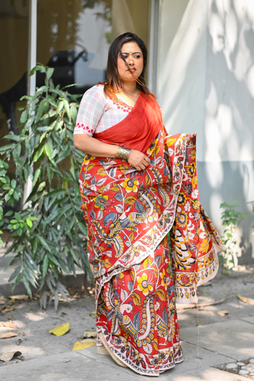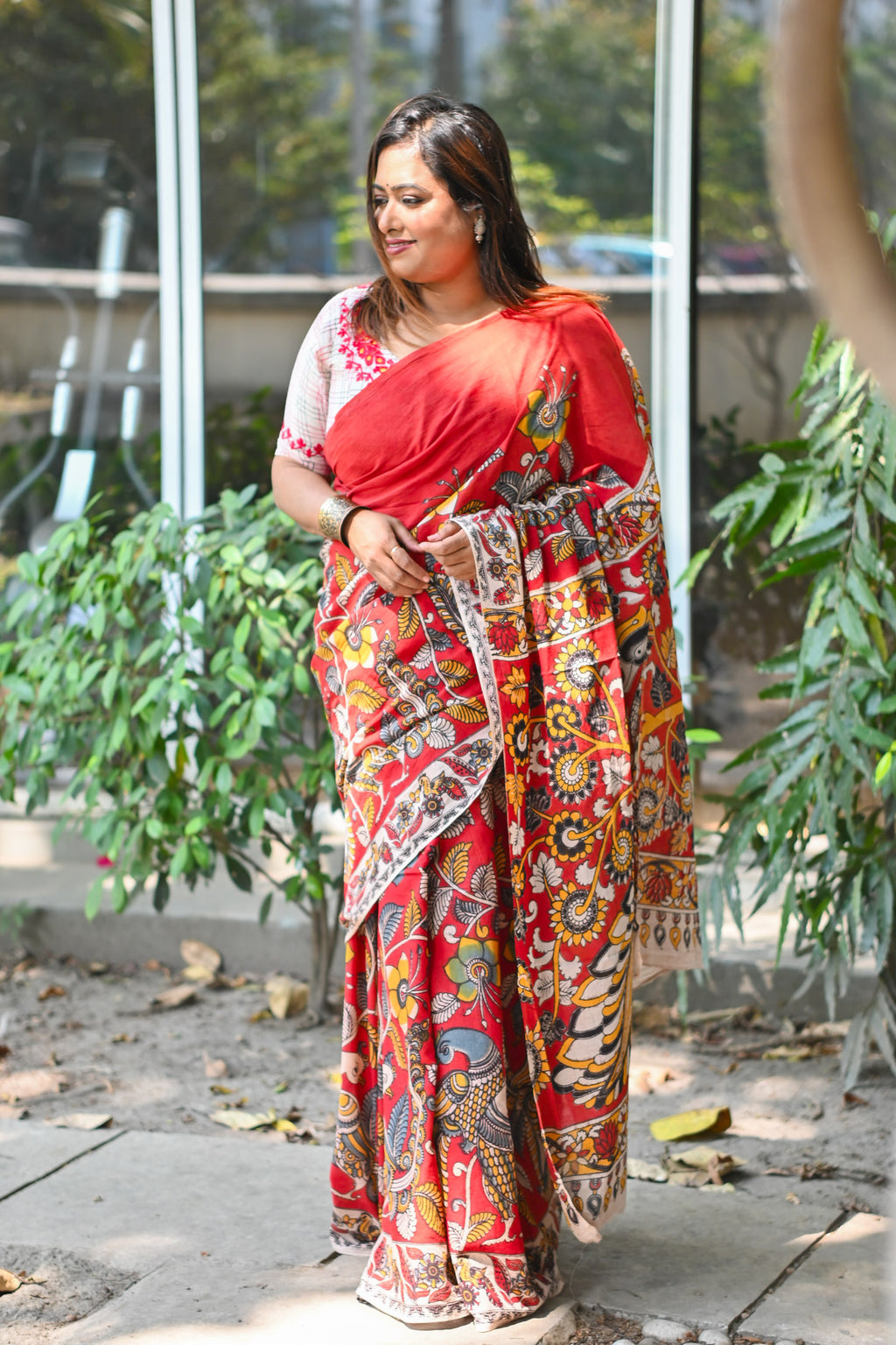 This saree brings classic Kalamkari charm to everyday comfort. The intricate print reads artisanal and modern at once—bold bird motifs on the pallu anchor the look, while the body carries a balanced mix of florals and geometry. The fabric stays cool, drapes cleanly, and photographs beautifully—no heavy starch, no fuss.