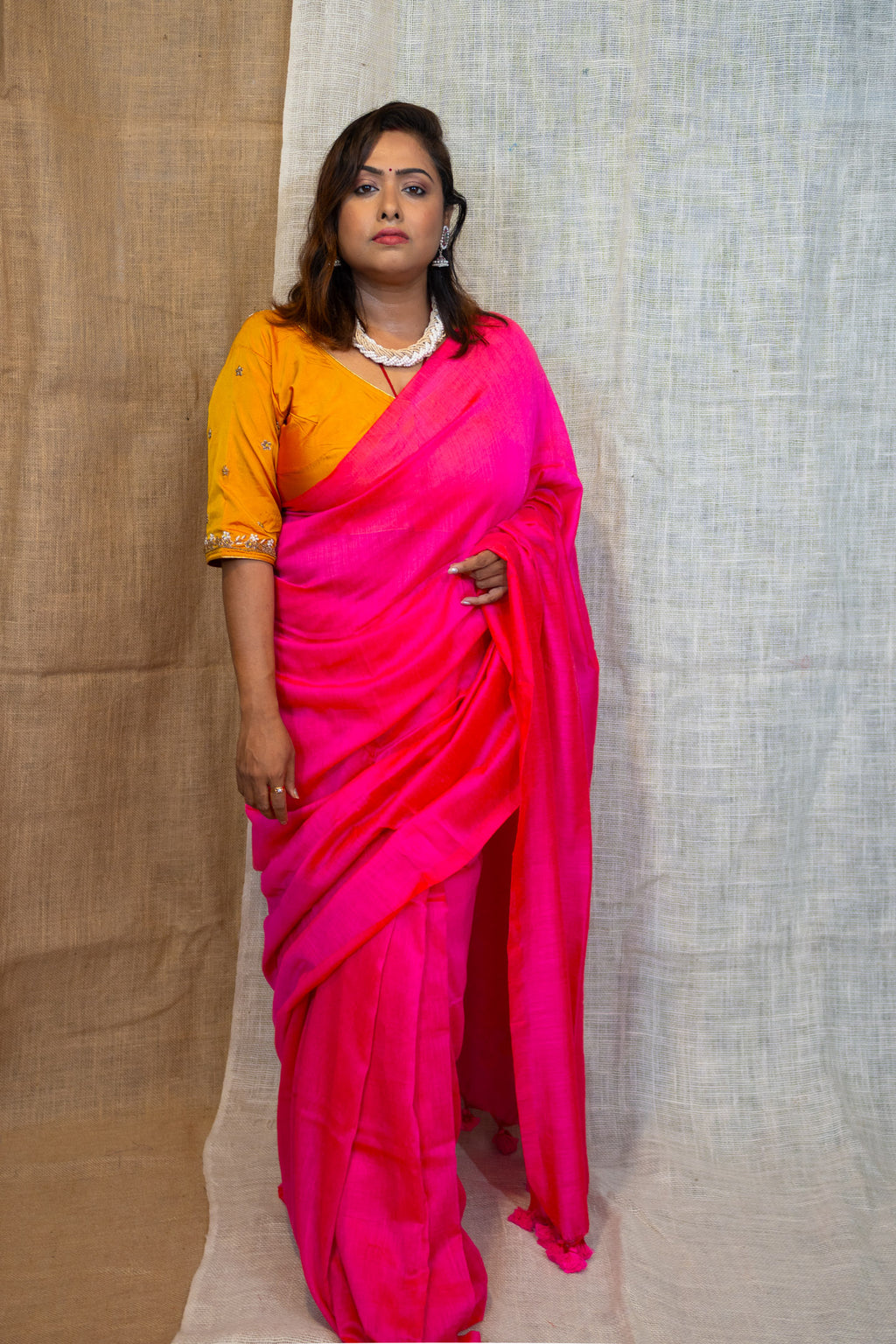 Step into effortless elegance with this Pure Cotton Linen Saree in a rich royal blue hue, finished with playful pompom tassels along the edge. Crafted from breathable cotton-linen, this saree blends comfort with sophistication—perfect for all-day wear. The lightweight drape feels easy yet chic, making it ideal for casual gatherings, office days, or festive evenings. Pair it with a contrasting blouse to let the saree’s understated charm shine.