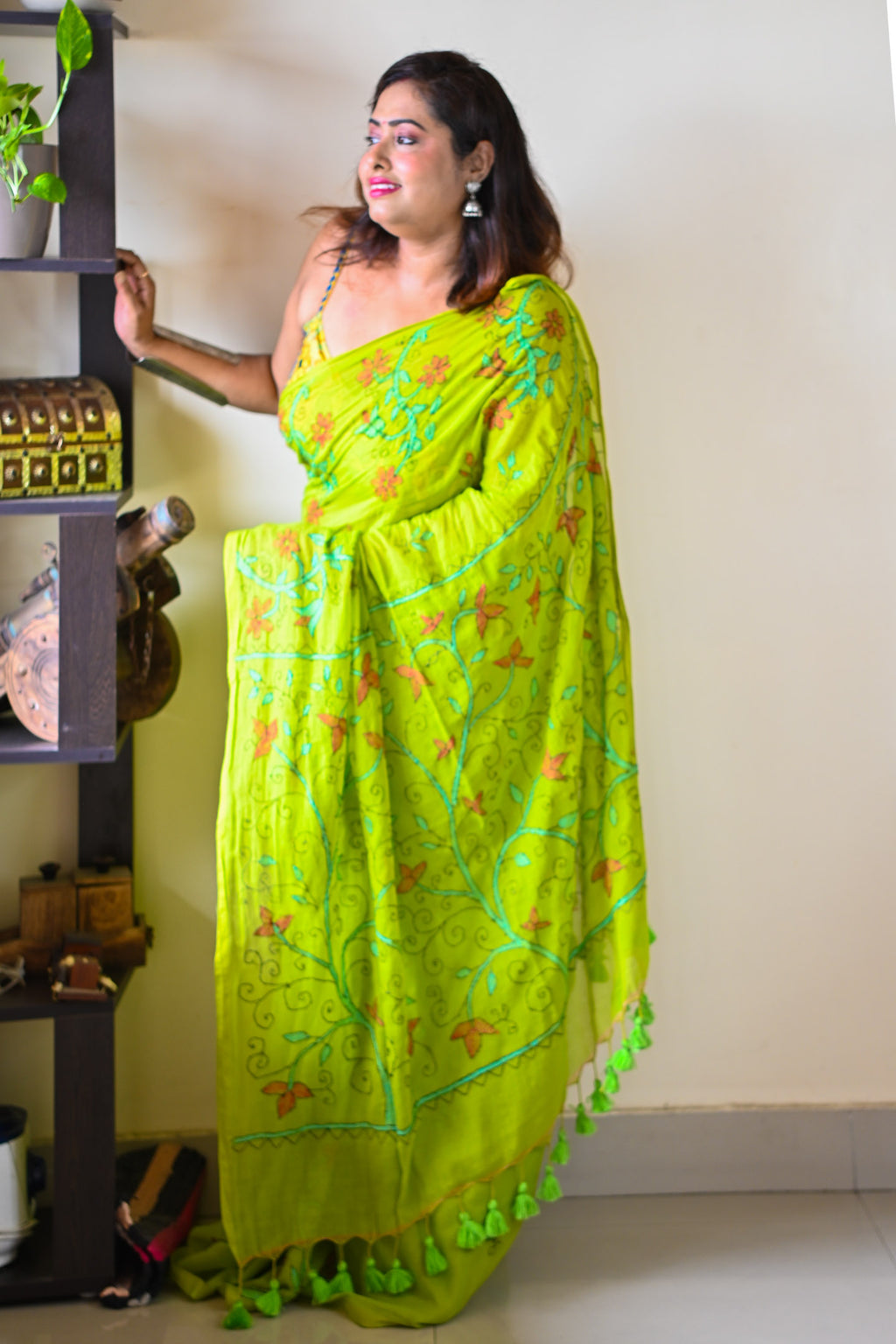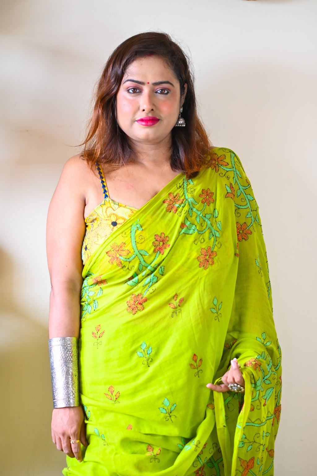 This Katha Stitch Mul Cotton Saree is hand-embroidered with traditional running stitches that tell small stories across its soft, breathable mul cotton base. Each thread is guided by hand — no two pieces are ever the same.