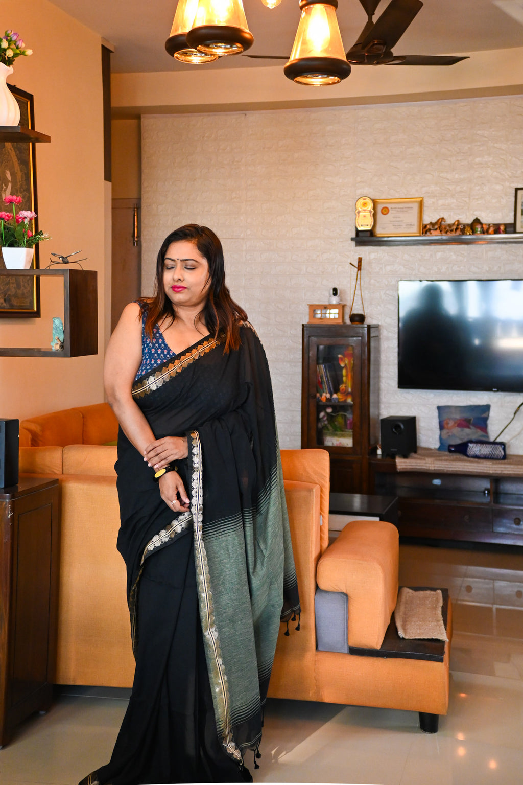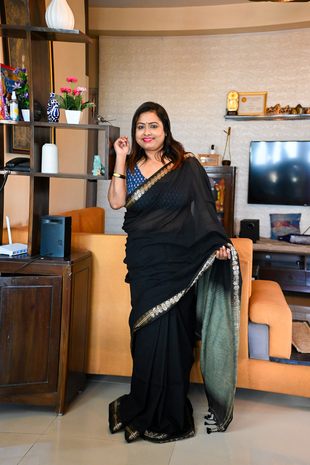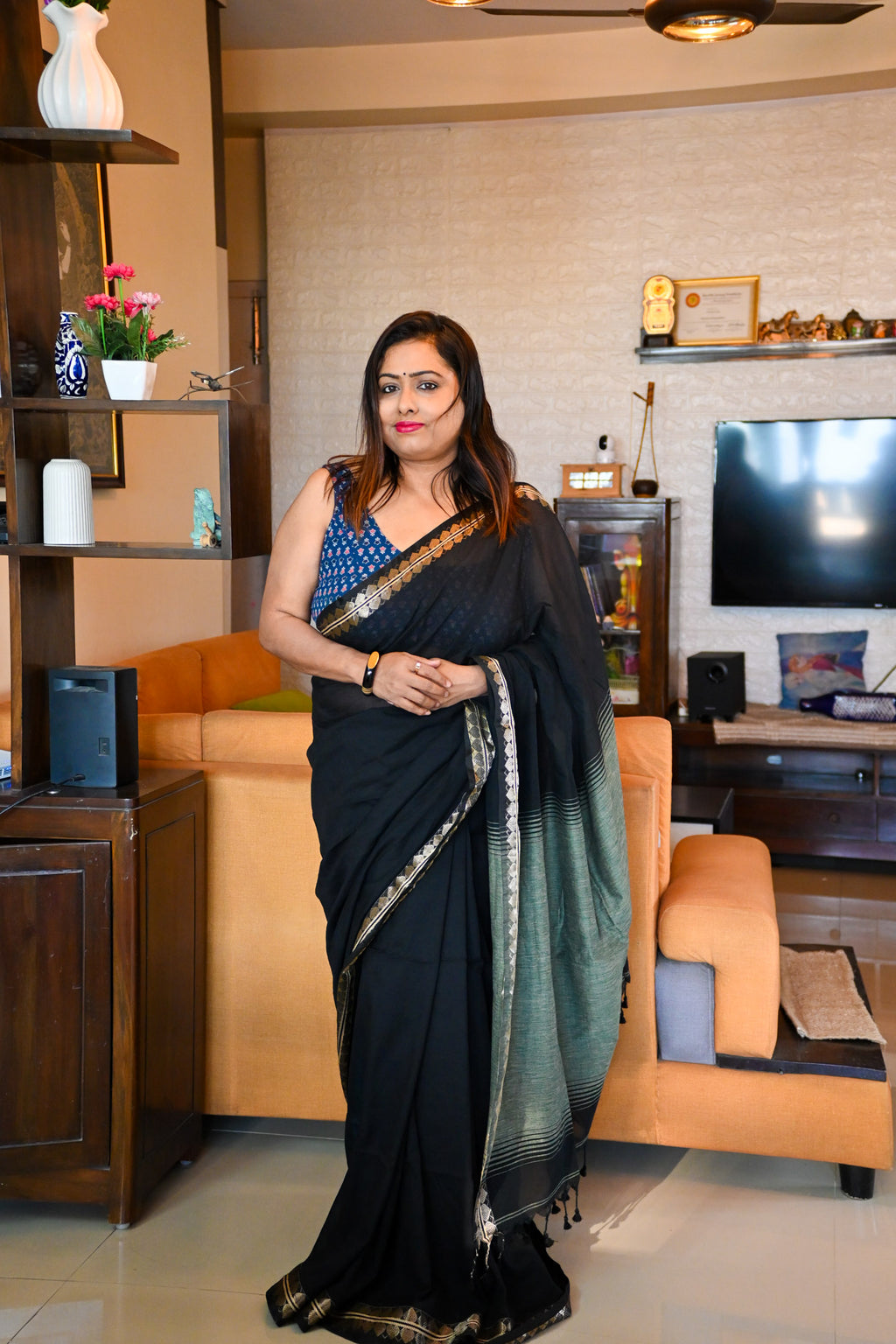 This Mul Cotton Saree is hand-embroidered with traditional running stitches that tell small stories across its soft, breathable mul cotton base. Each thread is guided by hand — no two pieces are ever the same.